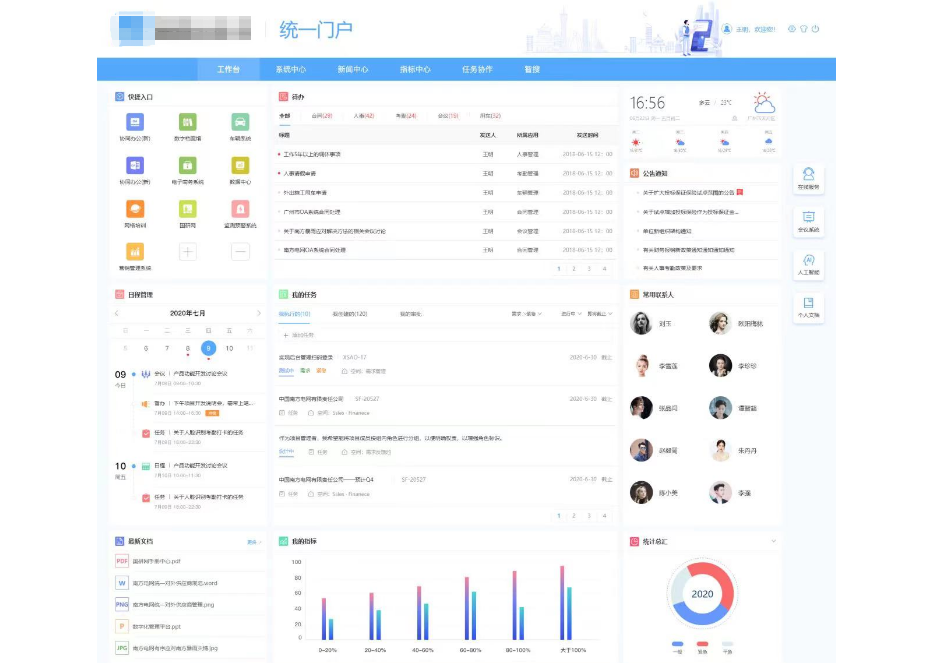 系统提供个性化首页作为信息展现平台,首页管理穿透各应用模块,整合各业务系统,形成统一消息、统一待办、统一数据,让用户有一个统一的工作平台。