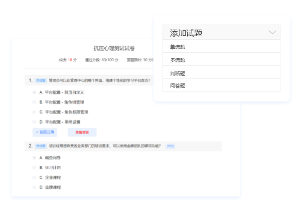 快速解决传统考试组织时间长,过程复杂,历时久等问题,提高考试的可靠性、有效性和工作效率,支持企业自定义组卷或随机组卷,包括支持设置单选、多选、填空、判断等多种常见题型,把控试卷难度。