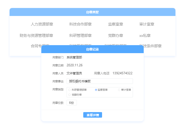 每次用章前都须在政府相关的系统中申请,经指定审批者审批通过后,再进行日常办公用章。