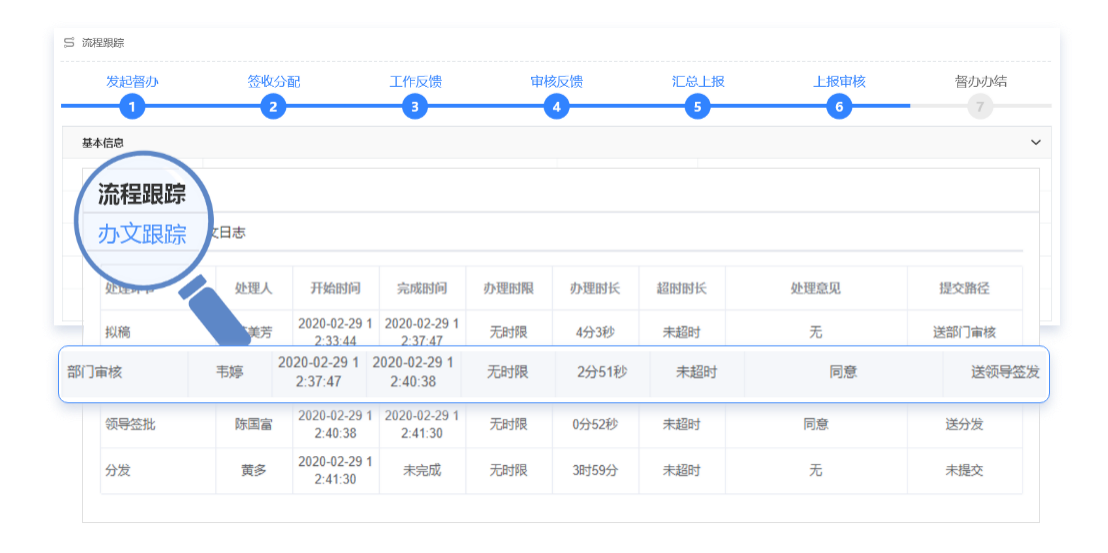 提供图形化流程跟踪与动画效果的流程重现,文件的处理过程和当前处理状态一目了然。还提供详尽的流程明细,为办文效率统计提供准确、可量化的参考依据。