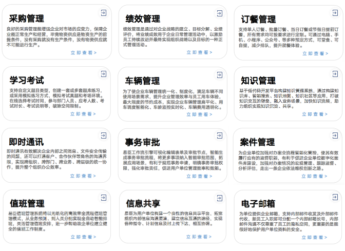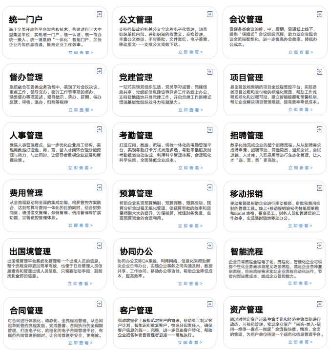 平台包含:公文管理、会务管理、督办管理、党建管理、请休假管理、出国境管理、日程管理、领导公务、任务报告、知识管理、即时通讯、流程管理等30+模块产品,助力打造智能内控服务,支撑生态组织的构建与优化,赋能组织“人、财、事、物”。